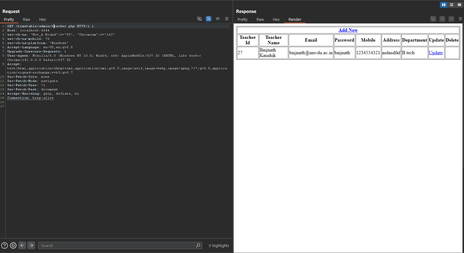 - Sensitive information disclosure: plaintext credentials (students/teachers), plus other PII displayed in these tables.